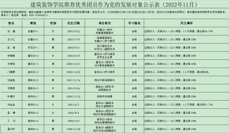建筑装饰学院推荐优秀团员作为党的发展对象公示表(2022年11月)