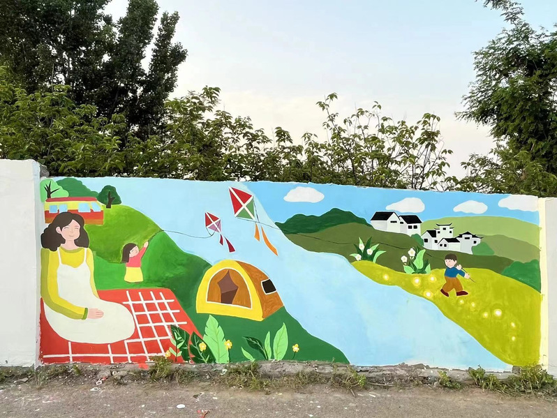 活动前期,学生党员在墙绘素材收集、墙绘主题选择、墙绘效果绘制等方面做了充足准备。绘制过程中,小组成员分工明确,经过打底稿、勾线笔描边、为图案配色上色,到最后的清洁工作都表现出了极大的耐心和认真。一面白墙,一支画笔,大家运用自己所学的专业知识和掌握的专业技能在墙面上设计作画,创作了多幅与“乡村振兴”“生态修复”相关的墙绘艺术作品。
