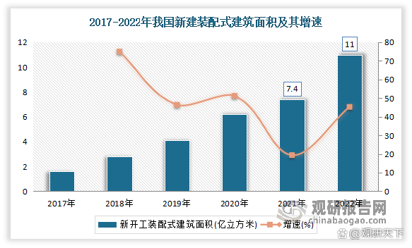 装配式装修是装配式建筑的重要组成部分。虽然我国装配式建筑起步较晚,至今不过十几年的发展历程,但近年来随着中央及各地方政府持续出台相关政策,从行业规范、项目扶持、技术监督体系建设等方面促进了我国装配式建筑行业的发展,加上装配式建筑的相关技术工艺发展逐渐成熟,我国装配式建筑行业迎来快速发展新阶段。数据显示,2016-2022年我国新建装配式建筑面积逐年增长。数据显示,2021年我国新开工装配式建筑面积达7.4亿平方米,较2020年增长18%,占新建建筑面积的比例为24.5%。到2022年我国新开工装配式建筑面积达11亿立方米,较2021年同比增长45.3%。